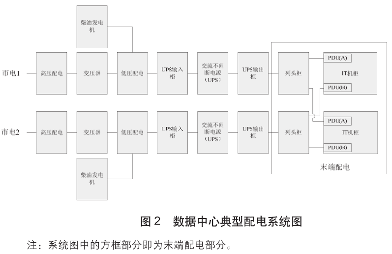 數據中心要實現持續穩定運行,前提是其供電系統應穩定可靠、不間斷。當前,重要程度高的A級數據中心一般采用2N架構的UPS供電方式,以實現容錯要求,供電系統包括高低壓配電、后備發電機組、不間斷電源、后備蓄電池、精密配電等子系統,典型的數據中心供電系統如圖1所示。