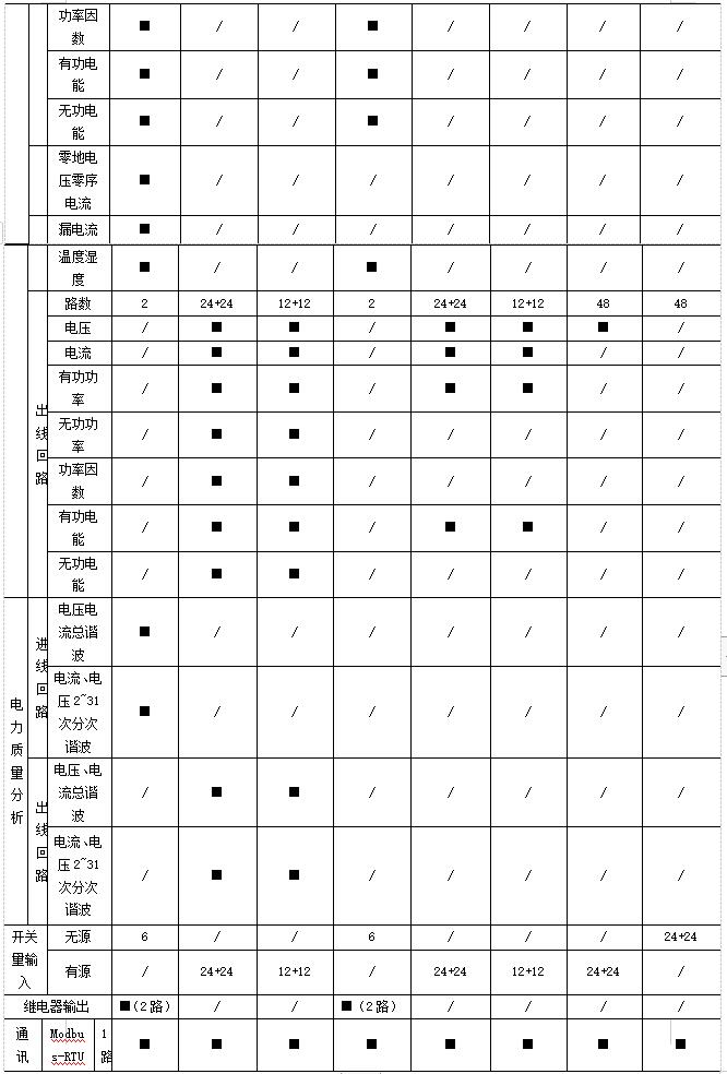 遙測:三相電壓、電流、有功功率、無功功率、視在功率、功率因數、有功電能、無功電能、電纜溫度,系統頻率、零序電流、零地電壓、漏電流、機柜溫度、機柜濕度、開關狀態、電壓/電流諧波含量、電流/功率;