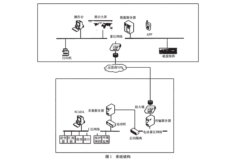 一層:總部集中管理中心層,部署大數(shù)據(jù)智能運(yùn)維平臺(tái),接收站端上傳的實(shí)時(shí)生產(chǎn)運(yùn)行數(shù)據(jù)、站端主要設(shè)備的運(yùn)行參數(shù)等數(shù)據(jù),對(duì)站端上傳的數(shù)據(jù)進(jìn)行多層次、多維度綜合分析處理、存儲(chǔ)、應(yīng)用、展示及發(fā)布,評(píng)估電站生產(chǎn)運(yùn)行情況,并提供生產(chǎn)運(yùn)行報(bào)表;實(shí)現(xiàn)對(duì)下屬多個(gè)電站的統(tǒng)一監(jiān)視和管理。二層:站端數(shù)據(jù)采集層,建設(shè)在電站就地,通過(guò)在生產(chǎn)控制一區(qū)部署通信管理機(jī)接收電站SCADA 監(jiān)控系統(tǒng)后臺(tái)轉(zhuǎn)發(fā)的逆變器、匯流箱、升壓站遙測(cè)和電能計(jì)量表(安全Ⅱ區(qū))、環(huán)境監(jiān)測(cè)儀數(shù)據(jù),并經(jīng)過(guò)橫向隔離裝置(正向型)傳輸?shù)焦芾硇畔^(qū)的數(shù)據(jù)服務(wù)器,位于服務(wù)器中的解析程序?qū)魅氲臄?shù)據(jù)進(jìn)行實(shí)時(shí)解析、入庫(kù)和統(tǒng)計(jì)分析。