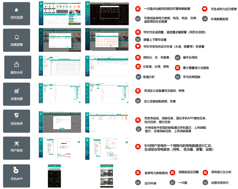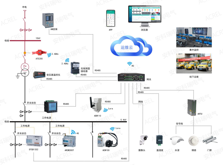 AcrelCloud-1000電力運維云平臺采用多功能電力儀表、無線通信、邊緣計算網關及大數據分析技術,通過智能網關采集現場數據并存儲在本地,再定時向云平臺推送數據。平臺可同時接入數以千計的用戶變電站數據。平臺采集的數據包括變電所電氣參數和環境數據,包括電流電壓功率、開關狀態、變壓器溫度、環境溫濕度、浸水、煙霧、視頻、門禁等信息,有異常發生10S內通過短信和APP發出告警信號。平臺通過手機APP下發運維任務到指定人員手機上,并通過GPS跟蹤運維執行過程進行閉環,提高運維效率,即時發現運行缺陷并做消缺處理。