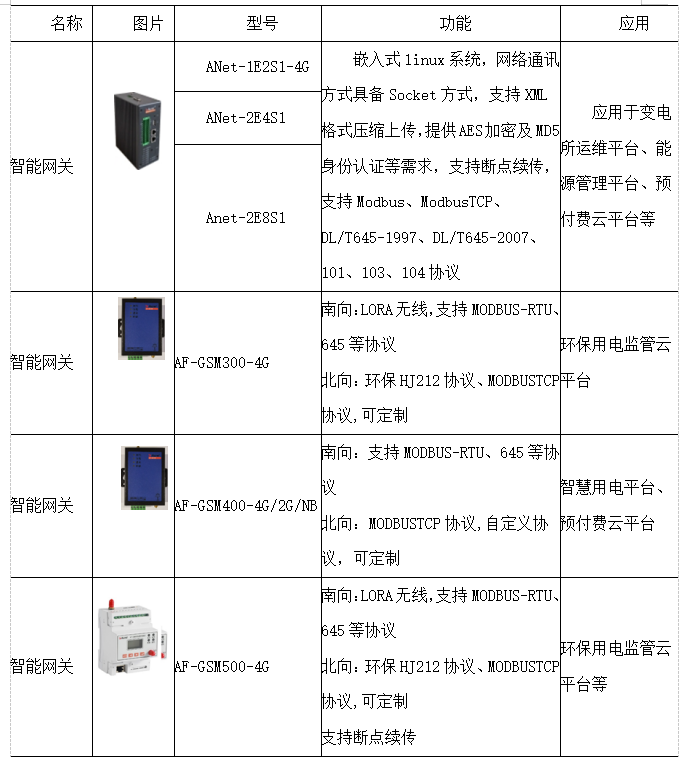 安科瑞根據多年來的項目經驗,結合用戶實際需求,開發了各類有線、區域無線、廣域無線通訊產品,包括網關和終端設備。支持RS485、以太網、LORA、ZigBee、GPRS、4G、NB-IOT等多種通訊方式,隨著5G建設步伐的加快,未來將會有越來越多的通訊方式融入產品,服務于泛在電力物聯網建設。