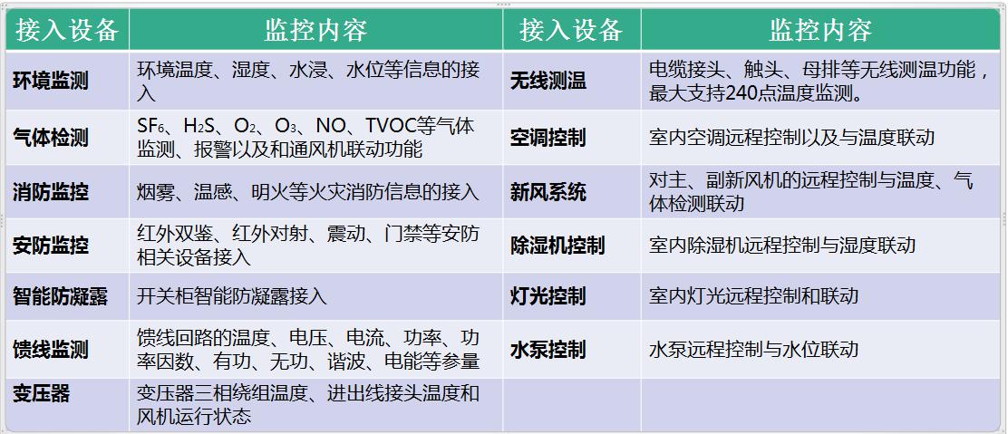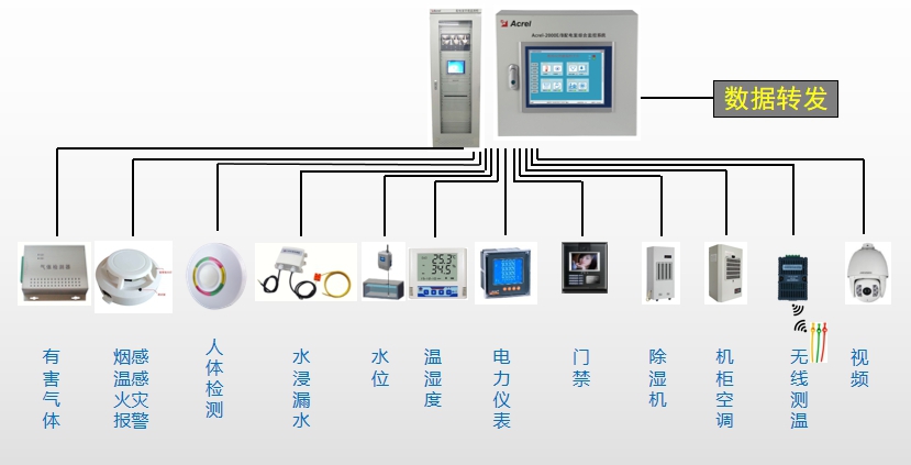 配電室綜合監控設備安裝在配電室、箱變、變電所內,通過采集和傳輸技術,可以實時監測配電室內的重要場所和設備的工作環境,如溫度、濕度、電纜溝水位、漏水/水浸、有害氣體(SF