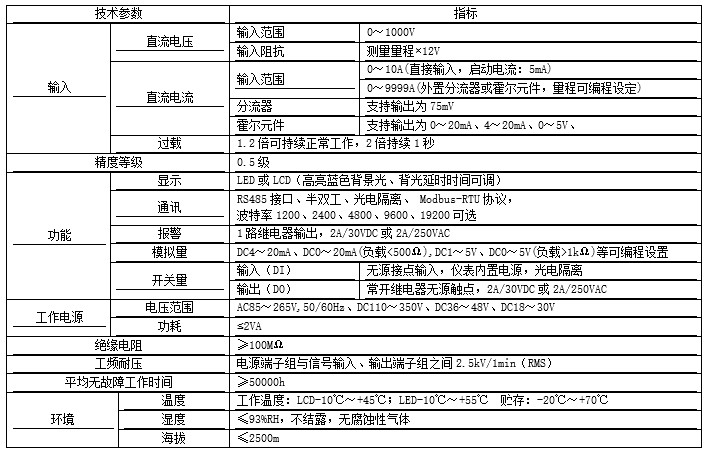 技術要求:輸入電壓DC 0-1000V;輸入范圍:0~2500A(外置分流器或霍爾元件,量程可編程設定);準確級0.5級。
