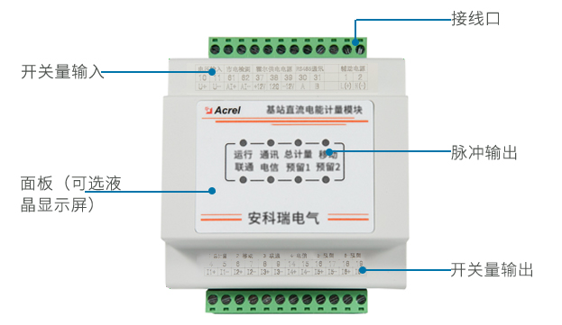 AMC16-DETT 基站直流電能計量模塊主要是針對有共享需求,且開關電源無分用戶電量計量功能的基站而設計的。儀表可對六個回路的直流電能進行計量,并可為配套的霍爾傳感器提供工作電流,同時可通過上位機軟件實現零漂校準,具有遙測、遙 信、遙調、實時電量計量、供電質量異常告警、信息存儲及處理、信息交互等功能。該模塊可分別計量三家運營商的直流用電量,為基站節能改善提供詳細的數據依據,為直流配電設備提供分項計量解決方案。
