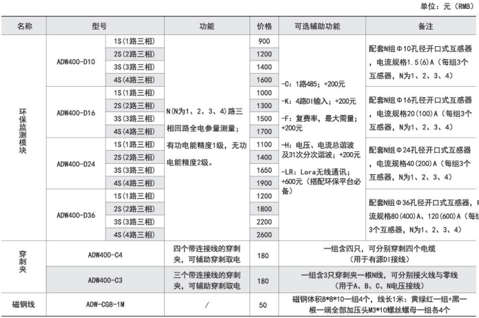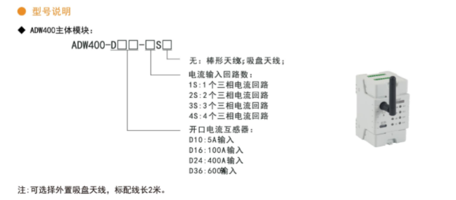 ADW400環保監測模塊主要用于計量低壓網絡的三相有功電能,同時可選擇四個回路的電流輸入,具有RS485通訊和470MHz無線通訊功能,方便用戶進行用電監測、集抄和管理。可靈活安裝于配電箱內,實現對不同區域和不同負荷的分項電能計量,統計和分析。