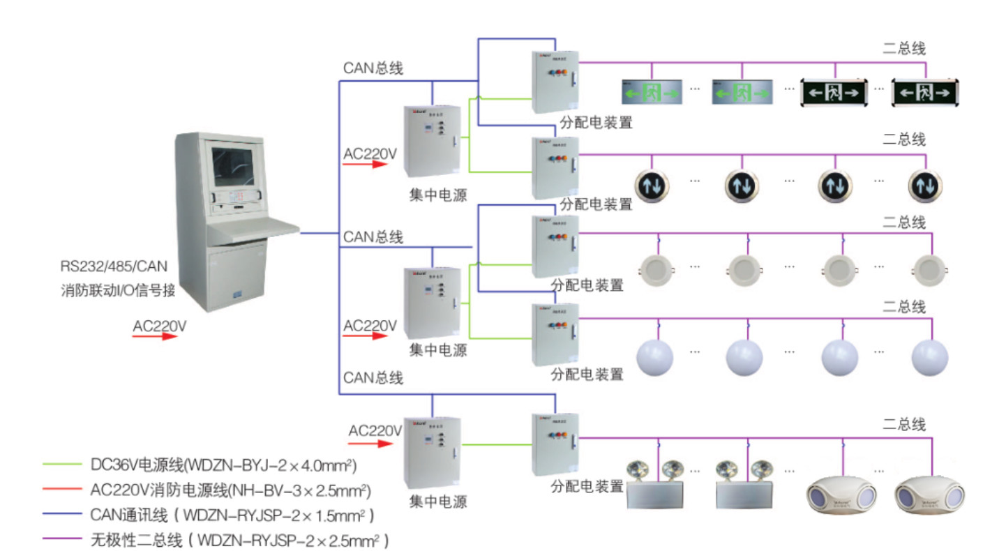 分配電裝置將應(yīng)急電源箱的電分配給燈具,并提供燈具與控制器之間通訊的橋梁作用。 |